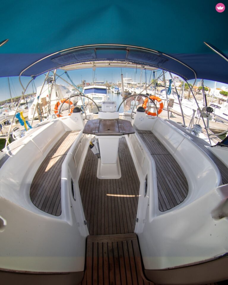 • Large "Mediterranean" cockpit with a full complement of cushions, a fold-out table, a shower, and a swim platform.